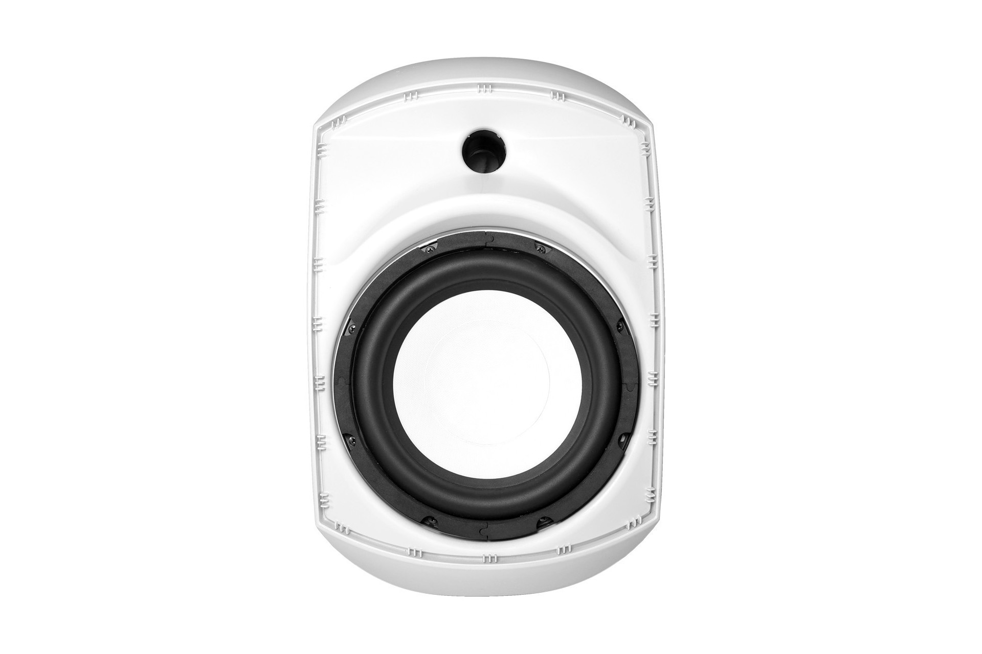Outdoor wall-mount 8-inch subwoofer, 120-watt, 8-ohm, max SPL @ 1 meter 105 dB, built-in low-pass filter, 360-degree mounting bracket, 70V/100V speaker with power tapping, frequency response 65-500 Hz, 80 degrees vertical and 100 degrees horizontal (75 Hz), 395 x 260 x 230 mm, white ABS housing, 4.9 kg.