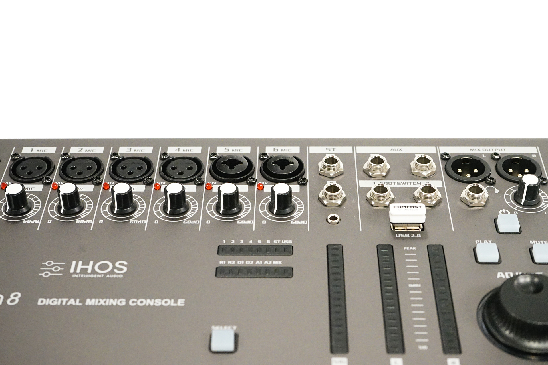 Digital mixing console , 8 channel - 6 mic inputs, 1stereo inputs, 2 XLR outputs, 2 bus, 4 Effects Modules ,2 reverb ,2 Delay, WIFI connecting to USB wireless module,1 LAN interface