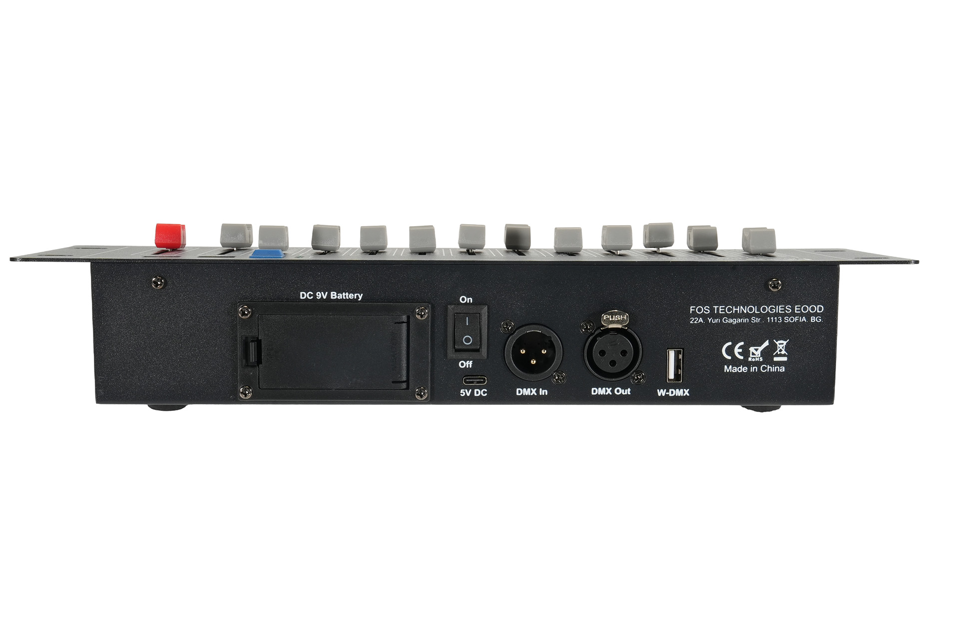 Portable DMX Controller featuring 36 DMX channels across 3 pages, equipped with12 faders and a master dimmer. Includes a display for selected channel and DMX value. Designed for compactness and ease of use, it offers a 3-pin XLR Female signal output. Powered via a 5V DC USB Type-C connection, with an optional 9V battery operation. Dimensions: 340 x 140 x 65 mm. Weight: 1.4 kg.