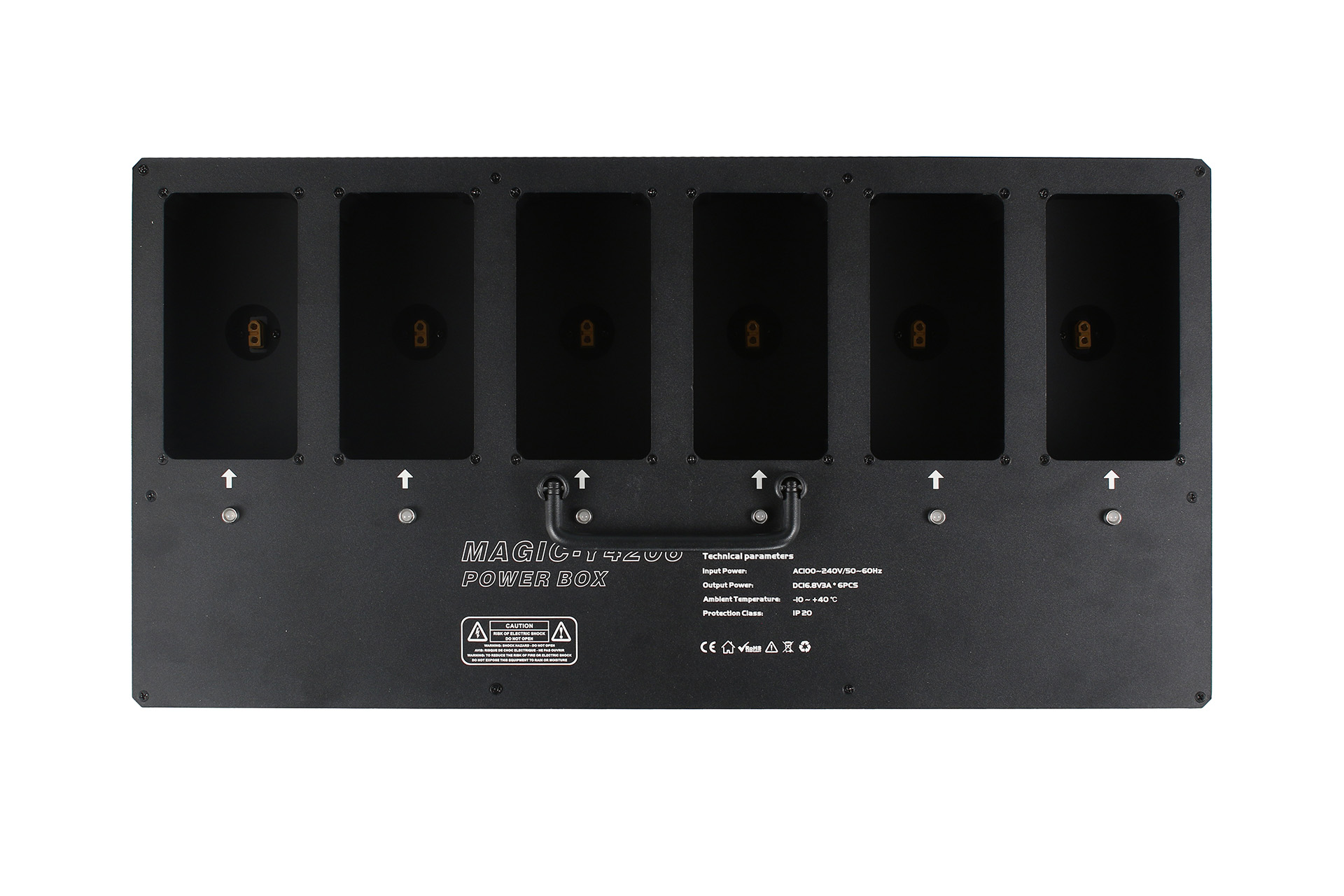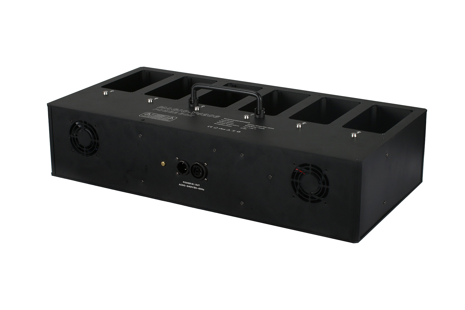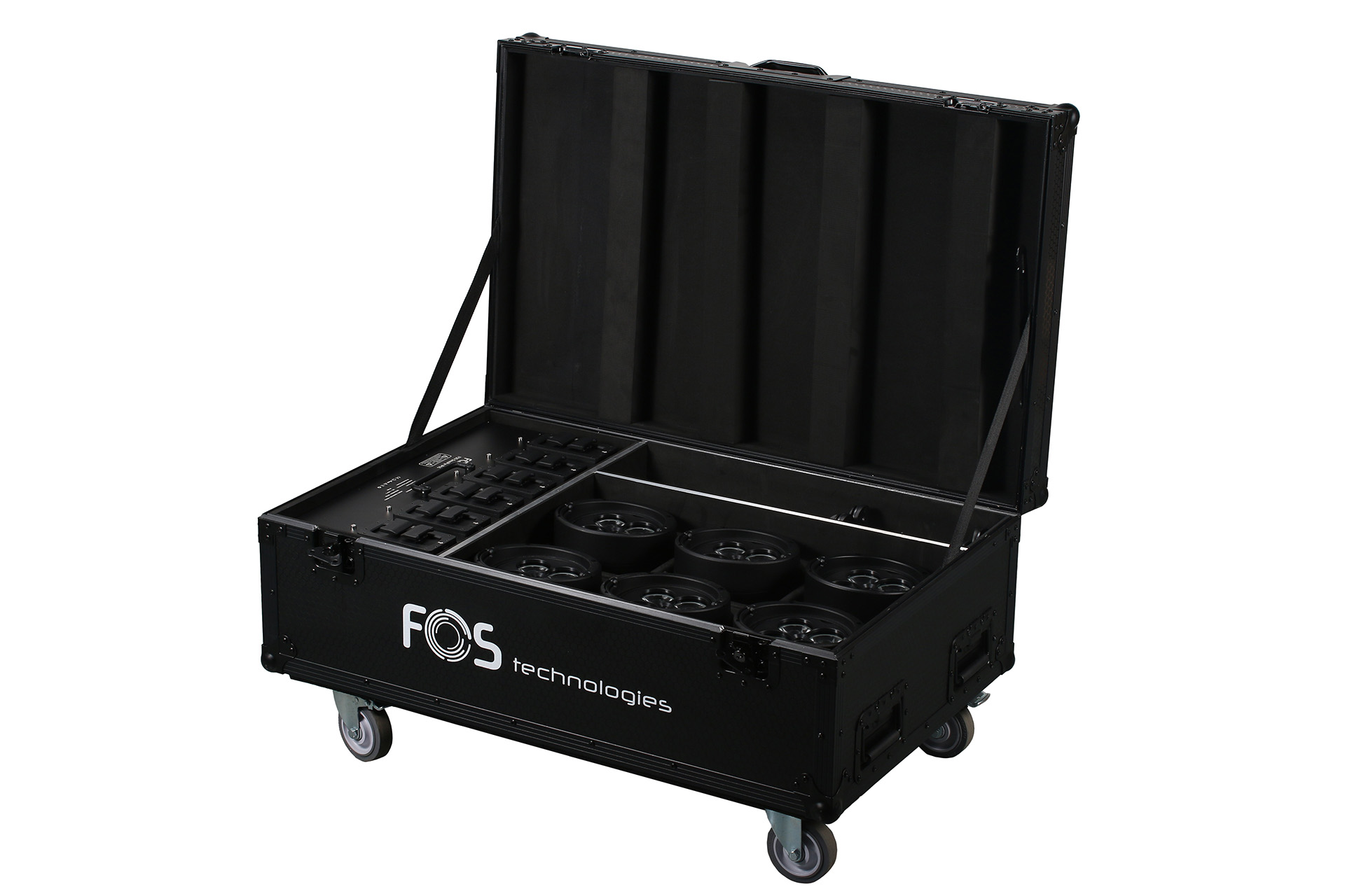 Flight case with wheels and a charging station for 6 Omni Par.