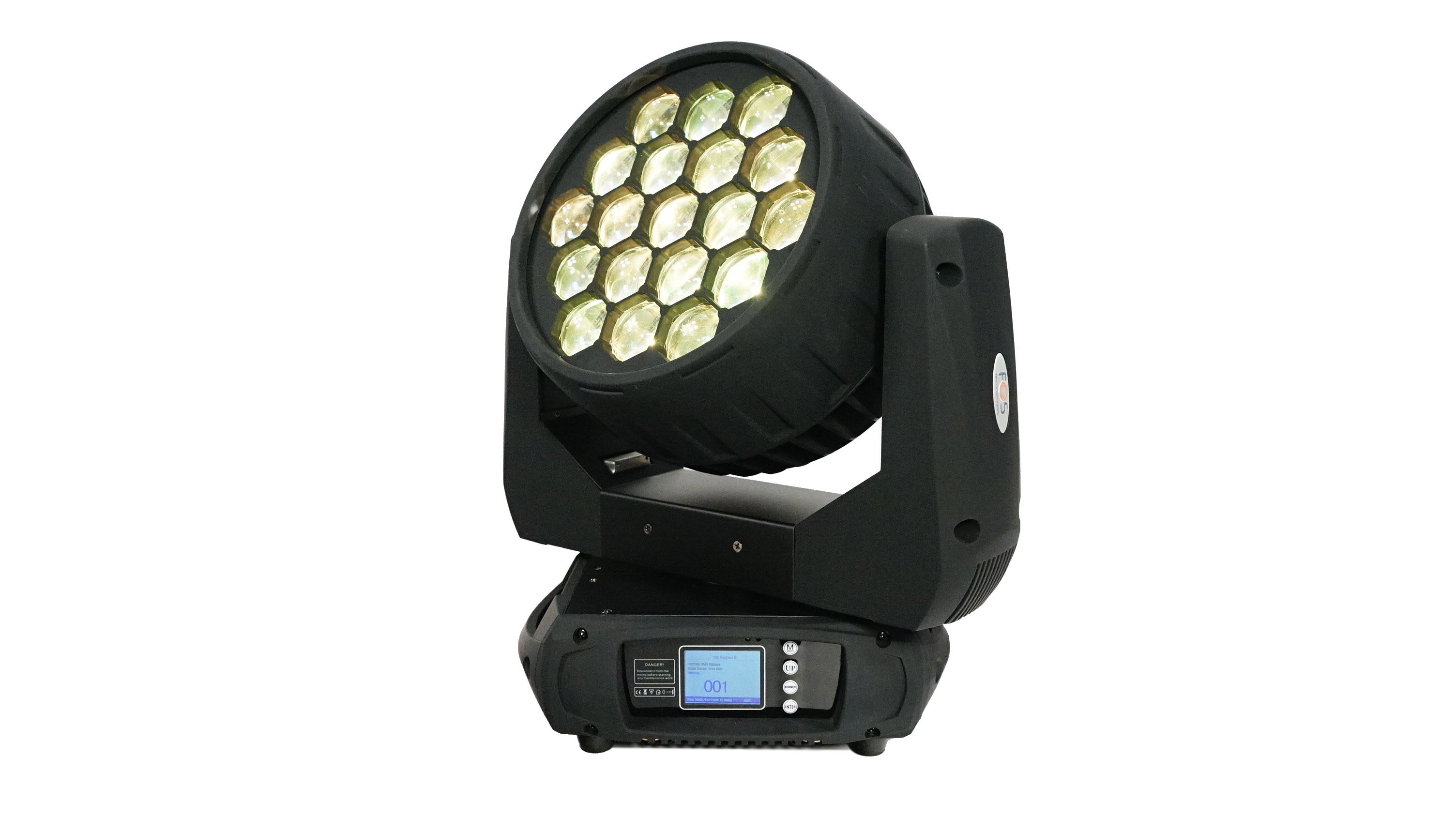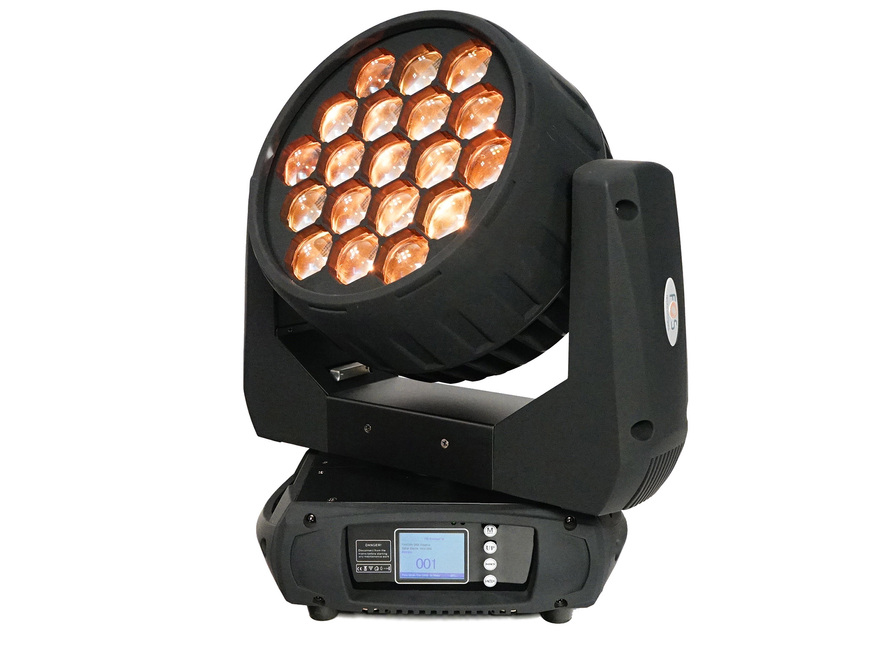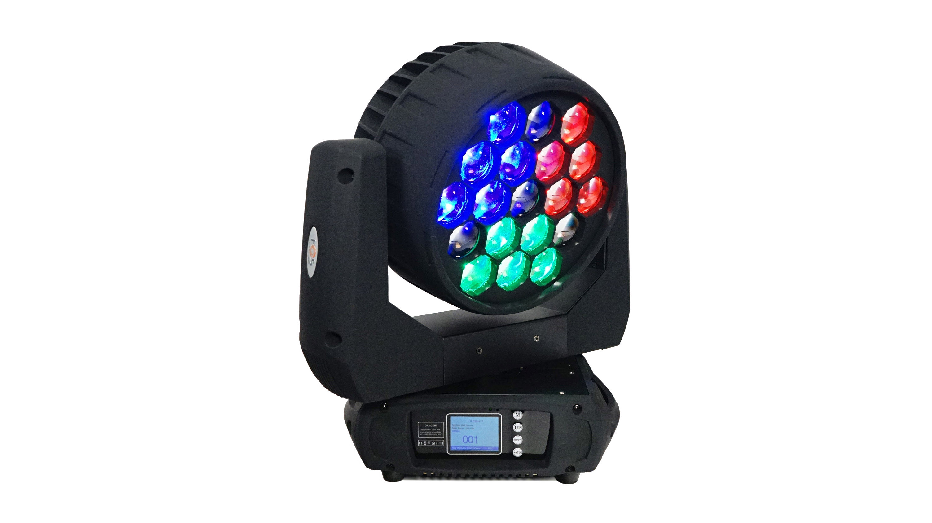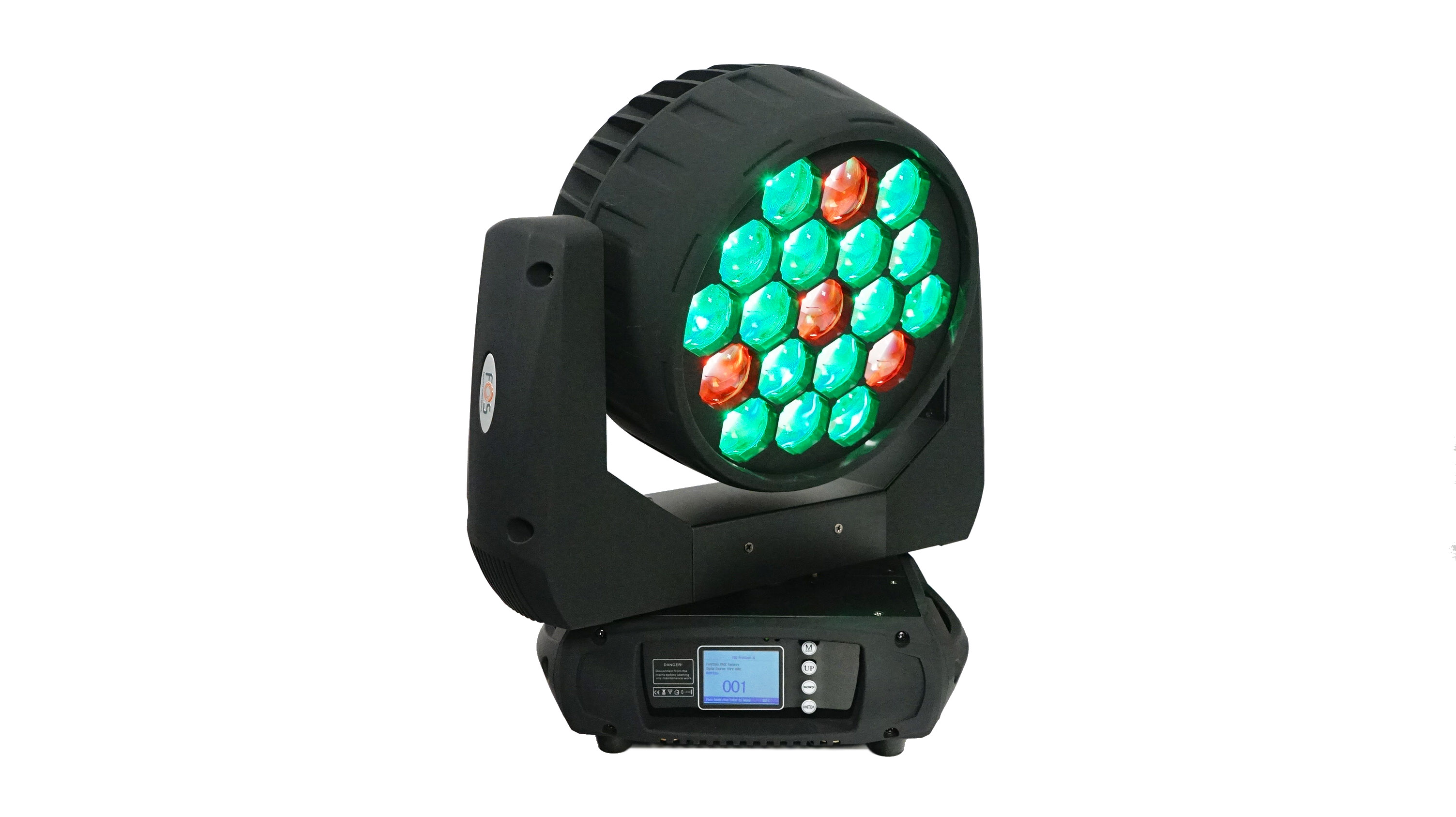 Wash / Beam moving head , 19 RGBW 15w 4in1 LEDs zoom 6-60°, 4 sections pixel control, Preset color macros RGBW mixing with or without DMX controller , TFT display.