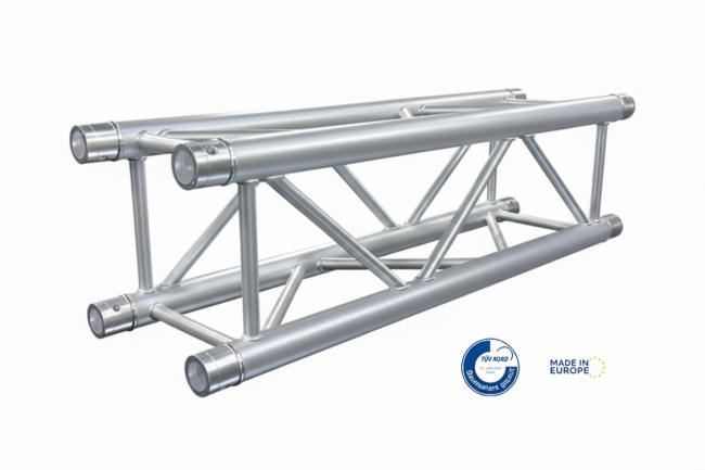 Aluminium truss QUA290A-V1 system 50 cm is defined by the quick connection system. 50x2 mm tubes , 20x2 mm braces, (4x pins, safety clips & couplers included), EN AW 6080 T6 high standard aluminum, TUV Certified , Made in Europe.