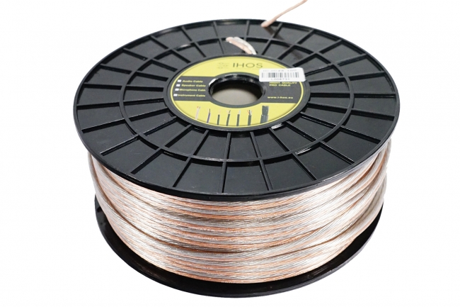 Professional speaker cable for installations on reel, 100 meters, transperent pvc, silver/gold 2x2.5mm conductors, outer dimensions 3.8mmx7.6mm,