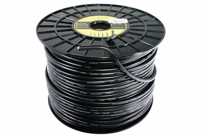 Professional speaker cable on reel, 100 meters black, 2x2.5mm inner conductor, blue/brown isolation, flexible pvc, outer dimensions 8mm.