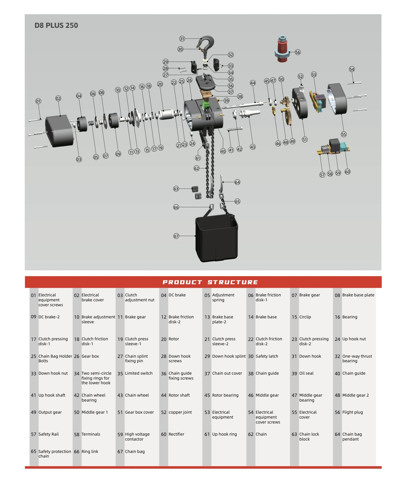 Professional weatherproof electric 250kg chain hoist, D8+ G100 load Chain, compliant with EN818-7, 8 times safety factor, TUV certified, self-climbing, double brake, overload protection with safety clutch device, direct control, lifting speed 4m/min, chain length 20m, chain bag and hook, low operating noise less than 60 dB, 12 kg and 24kg included chain.